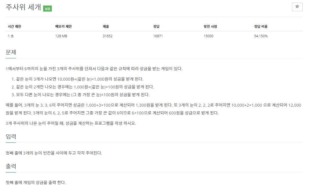 1에서부터 6까지의 눈을 가진 3개의 주사위를 던져서 다음과 같은 규칙에 따라 상금을 받는 게임이 있다. 같은 눈이 3개가 나오면 10,000원+(같은 눈)×1,000원의 상금을 받게 된다. 같은 눈이 2개