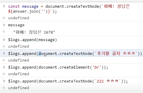 각각 태그와 텍스트를 만드는 메서드입니다. 단, 다른 태그에 append나 appendChild 하기 전까지는 화면에 보이지 않습니다.